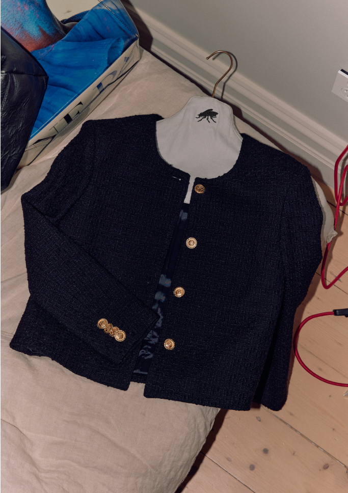 Single Breasted Jacket made with black wool boucle. Fabric made in Italy.